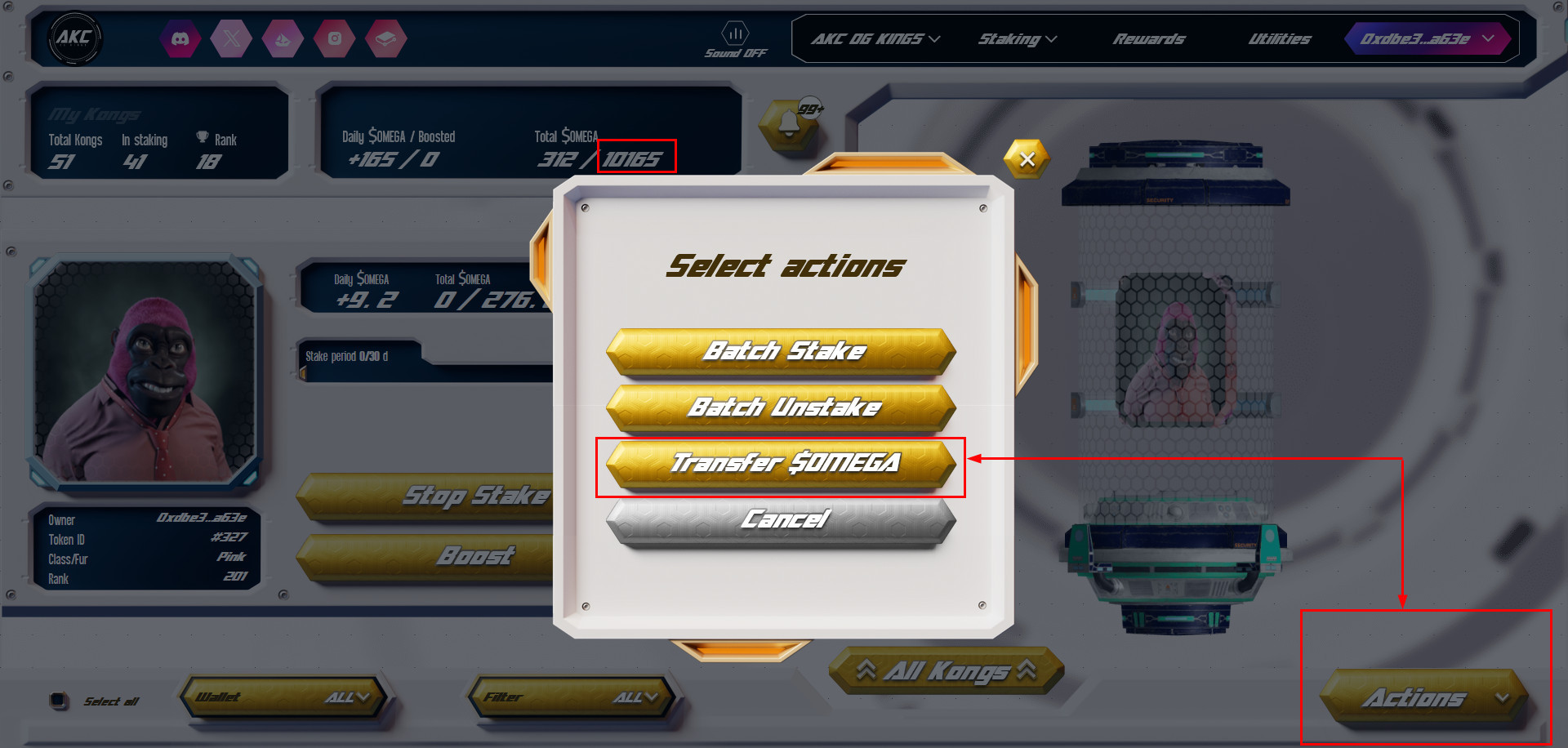 <figure><img src="https://2228328509-files.gitbook.io/~/files/v0/b/gitbook-x-prod.appspot.com/o/spaces%2FjFMTQDYa1HX29a9rQaG6%2Fuploads%2FsCUQcn0AYe1AfJr0PmVA%2Fsnap04514.jpg?alt=media&#x26;token=3cb50280-a1f4-462f-895b-3daff93cd7fa" alt=""><figcaption><p>Alternatively call Transfer $OMEGA option from the Actions on the Staking page</p></figcaption></figure>